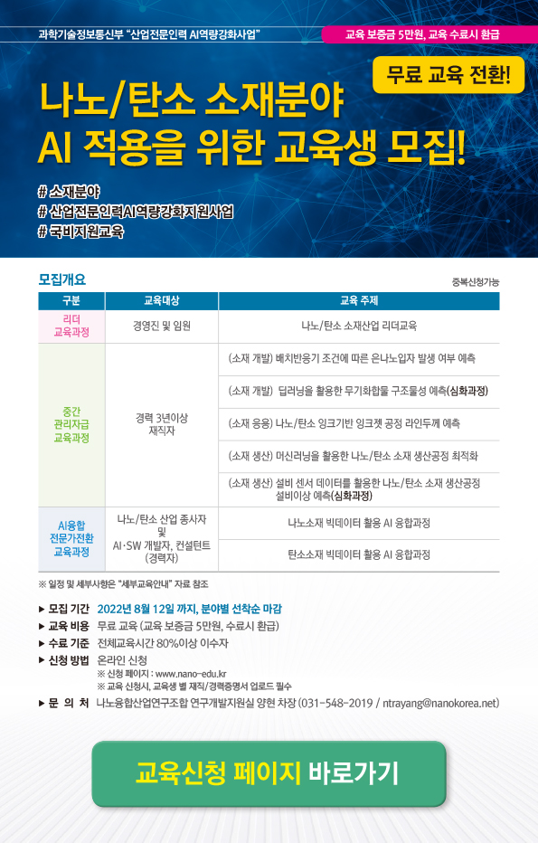 나노/탄소 소재분야 산업전문인력 AI 역량강화 지원사업 교육생 모집 (~7/30)