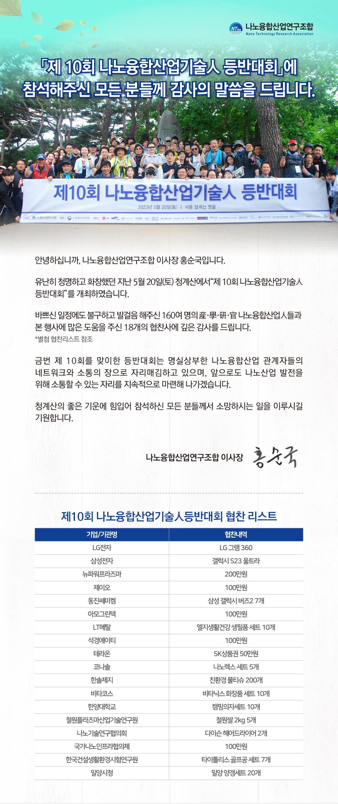 「제 10회 나노융합산업기술人 등반대회」에 참석해주신 모든 분들께 감사의 말씀을 드립니다.