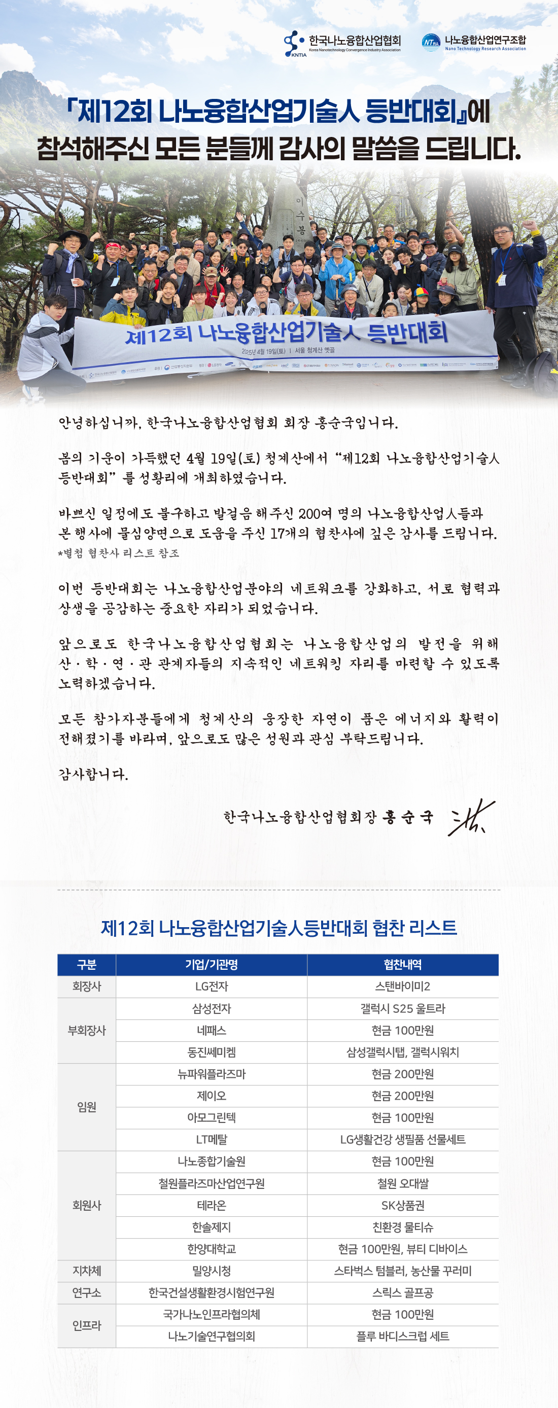 「제 12회 나노융합산업기술人 등반대회」에 참석해주신 모든 분들께 감사의 말씀을 드립니다.