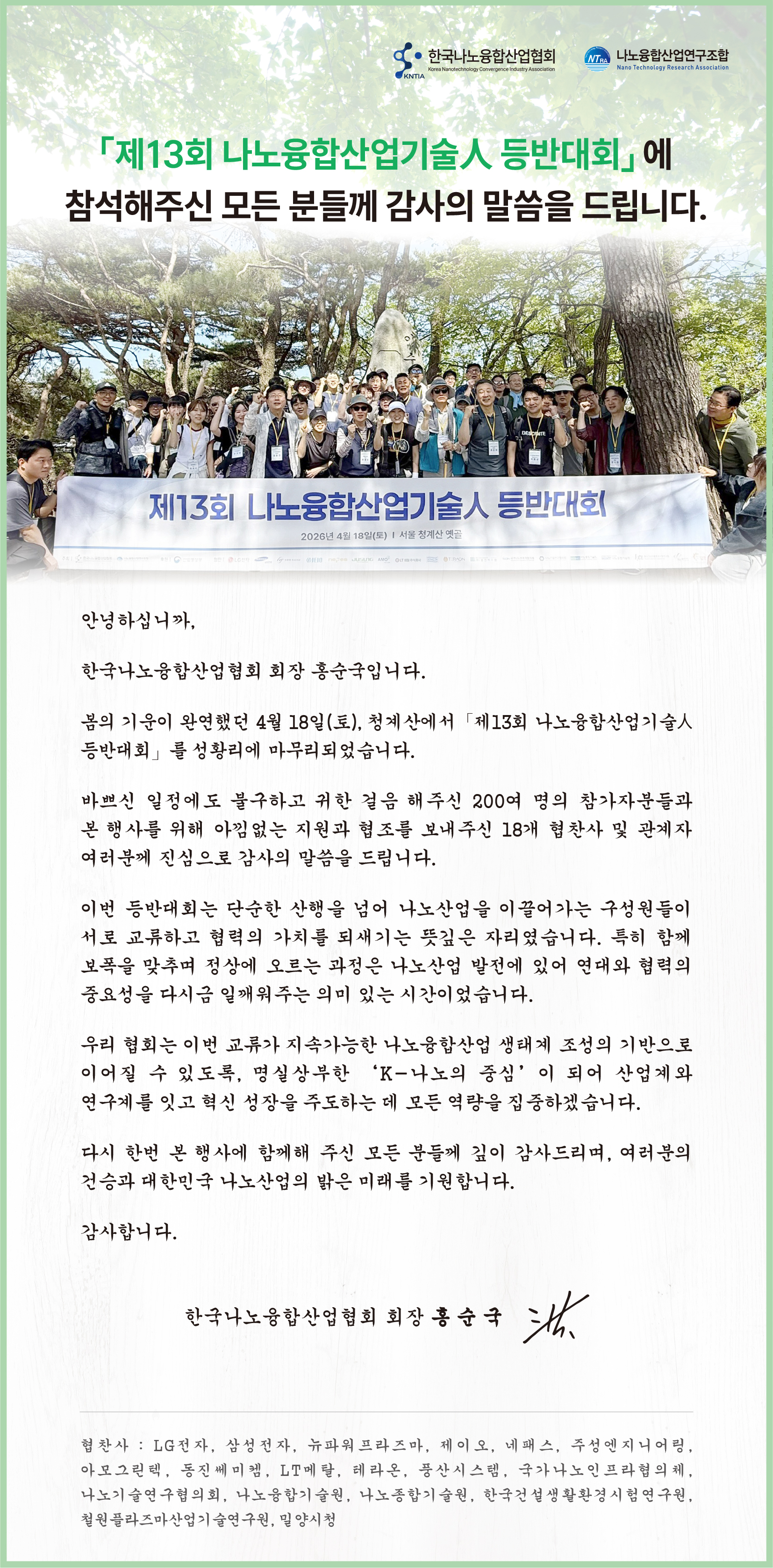 「제 13회 나노융합산업기술人 등반대회」에 참석해주신 모든 분들께 감사의 말씀을 드립니다.